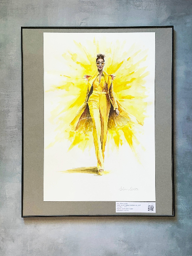 A striking fashion illustration that blends elegance with bold proportions and confident design. The poised figure and expressive brushwork convey both strength and sophistication, making this piece a statement of refined contemporary style.