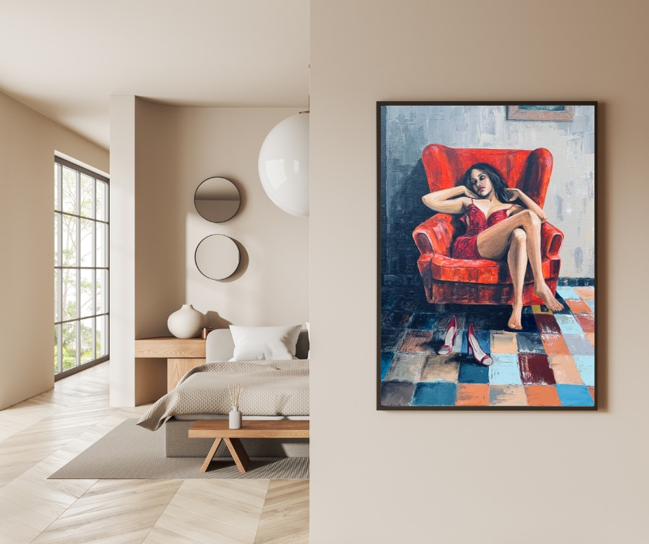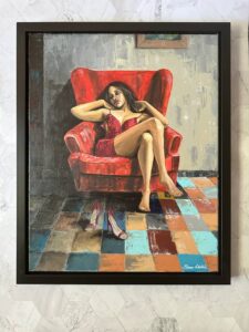 In “Off the High Heels,” a barefoot woman rests in a deep red chair — present, unguarded, and entirely herself. The work reflects that quiet transition between strength and softness, movement and pause. It’s about shedding expectations and simply existing.